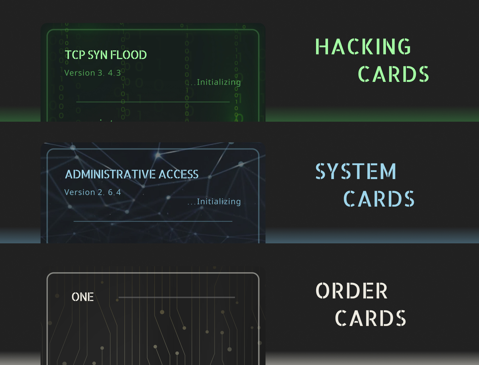 Three different types of cards needed to be designed: The Hacker, System and Order Cards. The game is one, where the players take on the role of intruding hackers, to steal money from a foreign system. The cards therefore needed to reflect this situation in their individual design.