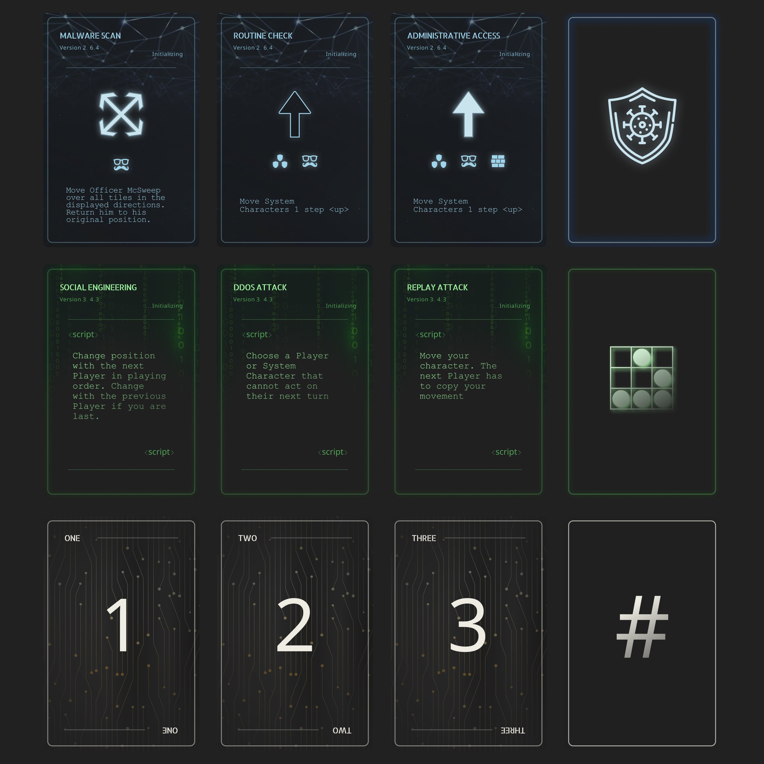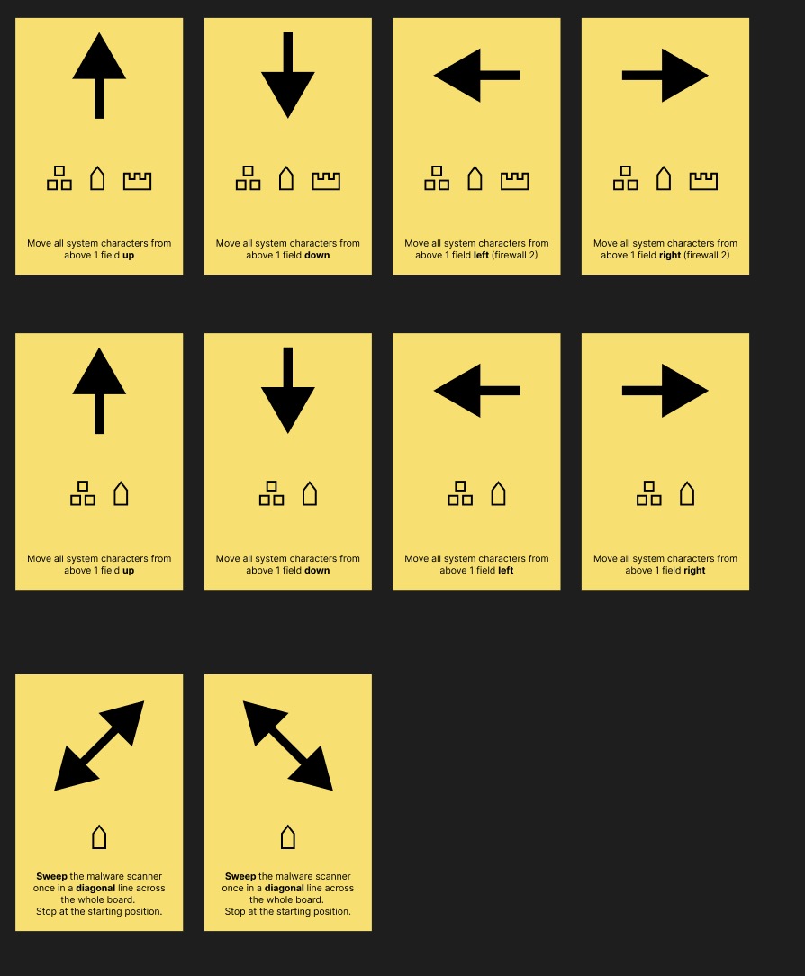 I am really happy with how the design turned out. The cards all have their unique qualities that make them stand out but still form a cohesive whole, that times them to the themes of our game! The System Cards look neat and orderly. The Hacker Cards ominous and deceitful.